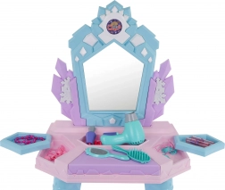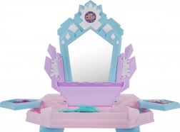A pasztellszínű pipereasztal a gyerekszoba szép dísze lesz, és támogatja a szerepjátékot, a kreativitást és a finommotorikát. A tükör alsó részén lévő gomb megnyomására felgyulladnak a fények és megjelennek a hercegnők, dallamok kíséretében. A gyerek hajszárító hangot ad és enyhe légáramot biztosít, így a fodrászos játék még valóságosabb.
