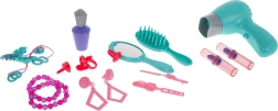 A készlet része egy biztonságos hajszárító 1× AA elemmel, amely gyengéden fúj és élethű hangokat ad – ideális fodrászszalonos szerepjátékhoz.