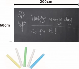 Az öntapadós fekete tábla azonnal használható írható felületet hoz létre sima felületen – szekrényen, ajtón, falon vagy bútoron. A 200 × 60 cm méret bőséges helyet kínál gyerekrajzoknak, családi üzeneteknek és munkahelyi jegyzeteknek. A felület hagyományos krétához készült, és könnyen tisztítható.
