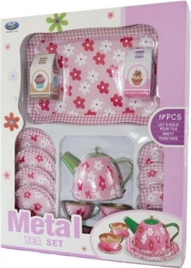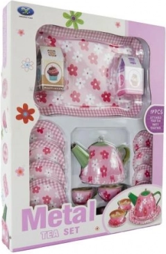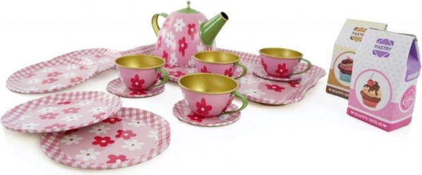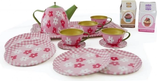Ez a fém edénykészlet szórakozást és kreativitást hoz a gyermekek játékába tea partikon. Minden szükséges elemet tartalmaz a tökéletes játékhoz, mint például a tálca, teáskanna, csészék, csészealjak, desszertes tányérok és két makett étel.