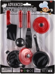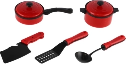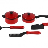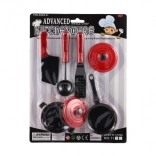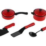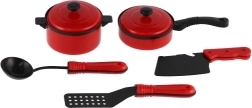 Gyermek konyhai eszközkészlet fekete-piros kivitelben, ideális kis szakácsok számára. Ez a készlet valódi konyhai eszközök imitációit kínálja, amelyek örömet okoznak minden gyermek számára és ösztönzik a kreativitásukat.