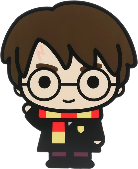 Visszarepít a varázslatok világába a karikatúra stílusú Harry Potter figurával, griffendéles sállal.
