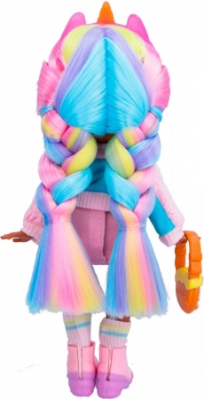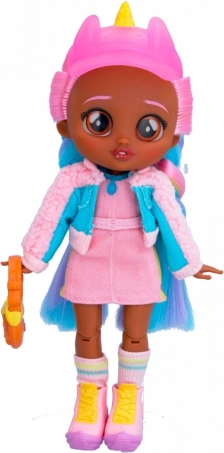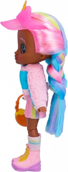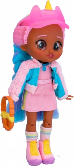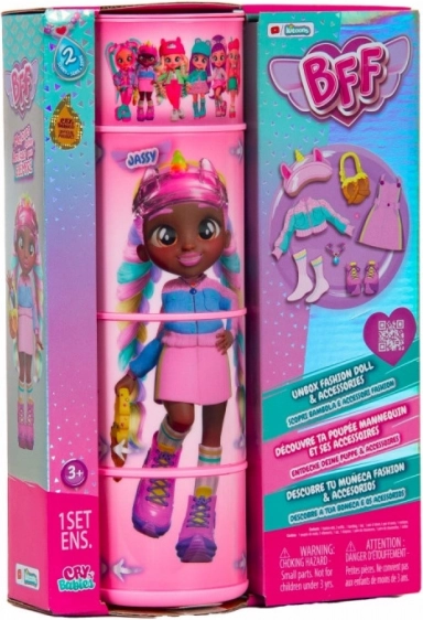Jassy stílusos, szivárványszínű hajával, üveg szemeivel és 6 mozgatható részével készen áll bármilyen kalandra! Divatos ruhát visel, amelyet egy bájos, unikornisszarvas kalap egészít ki! Sportos, rózsaszín-kék dzsekit, aranyos rózsaszín szoknyát és hozzá illő sportcipőt hord! Ne felejts hozzátenni a perec alakú táskát és a BFF nyakláncot is!