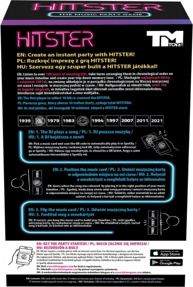 \nA Hitster egy parti játék, amely minden pillanatot felejthetetlen szórakozássá alakít. Az ingyenes alkalmazás és a DJ ösztönök segítségével fedezze fel, melyik barátja emlékszik a legtöbb zenei tényre, és tud tökéletes idővonalat készíteni a számokból: