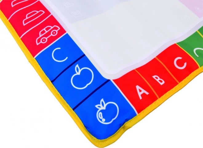 A szőnyeg szélét betűk, számjegyek és egyszerű képek díszítik, amelyek megmutatják a gyerekeknek, hogyan rajzolhatnak könnyedén kisautót, almát, nyuszit, házikót és más formákat. Támogatja a koncentrációt, a finommotorikát és a játékos, természetes tanulást.