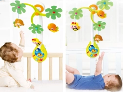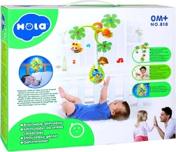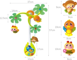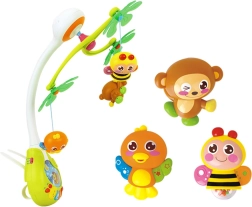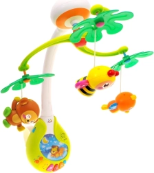 Ez a vidám körforgó zenélő egységgel vizuális, auditív és taktilis ingereket kínál a babának. A függő figurák – méhecske, majmocska és kismadár – finoman forognak, miközben a kellemes dallamok és a tompított fény megnyugtató légkört teremtenek az könnyű elalváshoz.