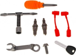 A készlet gyerek szerszámokat tartalmaz: keresztfejű csavarhúzó, 3 az 1-ben kulcs (dugókulcs + lapos + keresztfejű), 2 az 1-ben kulcs (lapos + gyűrűs) és további kiegészítők. A gyerekek biztonságos módon próbálhatják ki az alapvető mechanikai műveleteket.