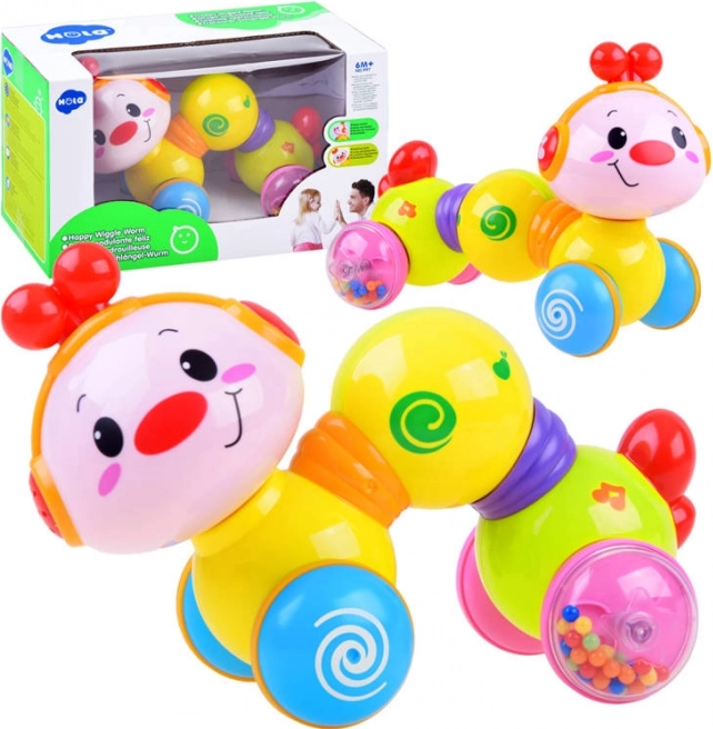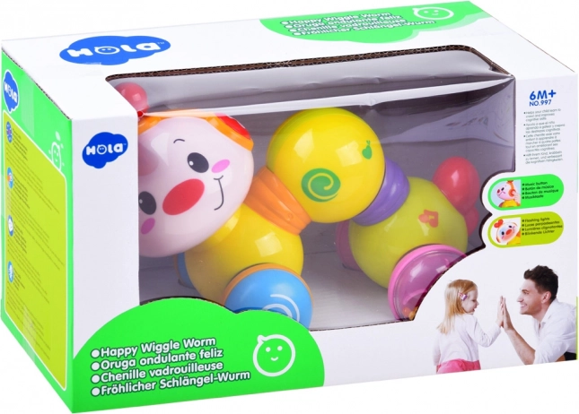 A Happy Wiggle Worm interaktív guruló hernyó ideális játék babáknak és totyogóknak. A hát megnyomására a hernyó kinyúlik és előre gurul sima felületen, miközben a feje színt vált, és kellemes dallamok szólnak. A forgatható fej ösztönzi a kíváncsiságot és fejleszti a finommotorikát.