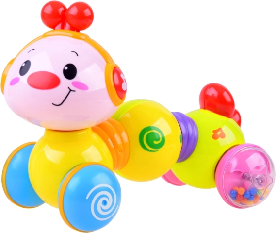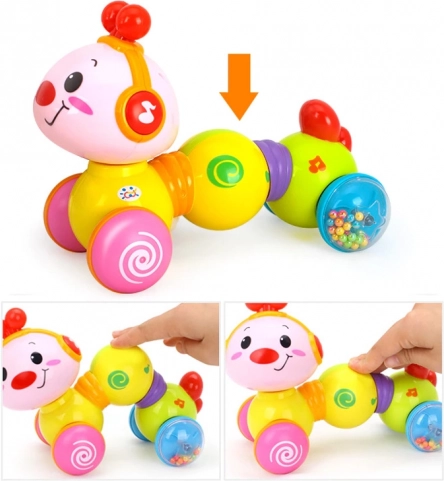 Vidám, kerekeken guruló interaktív hernyó, amely megnyomásra elindul, világít és dallamokat játszik. Támogatja a mászást, a motoros készségek fejlődését és az ok–okozat megértését már 6 hónapos kortól.