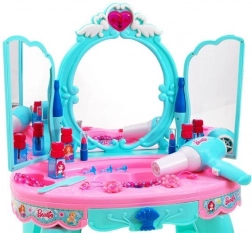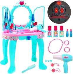 Az interaktív pipereasztal örömet szerez a divat és szépség kis rajongóinak. Masszív és biztonságos anyagokból készült finom pasztell rózsaszín és türkiz árnyalatokban, amely barátságos és elegáns megjelenést nyújt. A tükör feletti szívecske megnyomásával finom LED fények és dallamok aktiválódnak, varázslatos hangulatot teremtve.