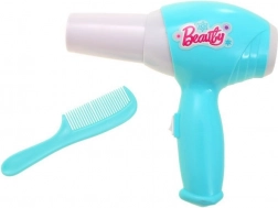 A csomag része egy elemes gyerek hajszárító, fésű, ékszerek és kozmetikai utánzatok – minden a valósághű és kreatív játékhoz.