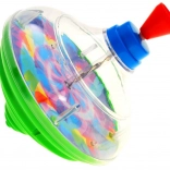 Hagyományos játék modern köntösben: színes pörgettyű, amely forgatás közben világít és vidám zenét játszik. A dugattyú lenyomásával könnyen beindítható, a pörgettyű saját tengelye körül forog, az átlátszó burkolat alatt pedig elbűvölő szivárványhatás keletkezik. Strapabíró műanyag kivitel, ideális a finommotorika és a koordináció fejlesztéséhez.