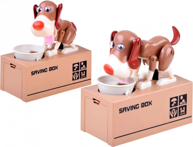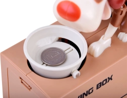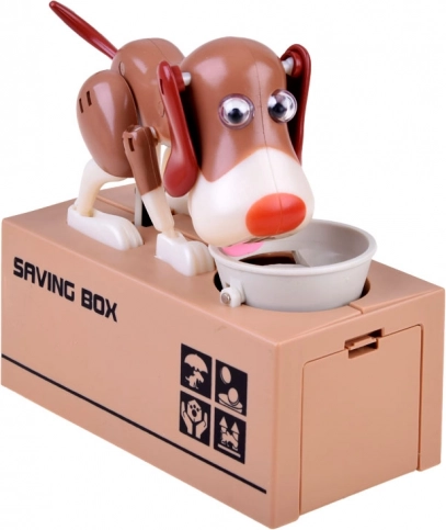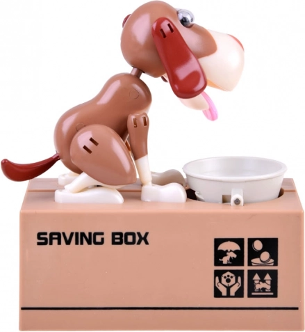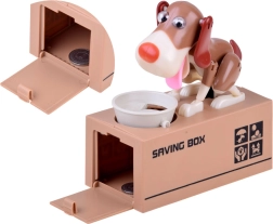 Dobja az érmét a kutya előtt lévő tálba. A kutya mozogni kezd, mintha az ételt enné a tálból, és az érmét a perselybe ejti. A kutya vidáman mozog és rázza a füleit. A működéshez 3 elem szükséges. A persely segít a gyerekeknek megérteni, hogy a megtakarítás nemcsak szórakoztató, hanem pozitív eredményeket hoz.