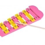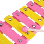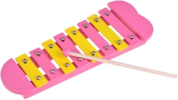 Színes xilofon jelölt hangokkal, amely segíti a gyerekeket egyszerű dallamok összeállításában és a zenei érzék gyakorlásában. A csomag része egy fa ütő.