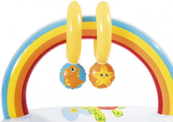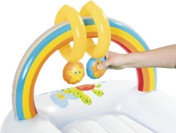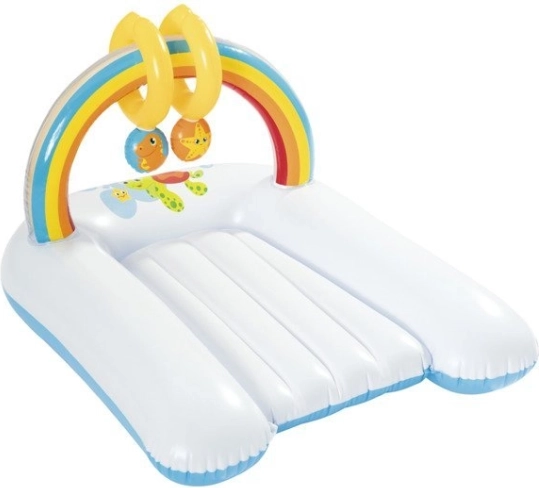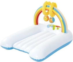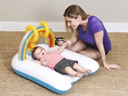 Az alátét fölött színes játszóhíd két sípoló játékkal segíti a baba figyelmének lekötését, így a pelenkázás is könnyebbé válik. Leeresztés után könnyen kis csomaggá hajtható – tökéletes megoldás utazáshoz, nyaraláshoz és látogatásokhoz.