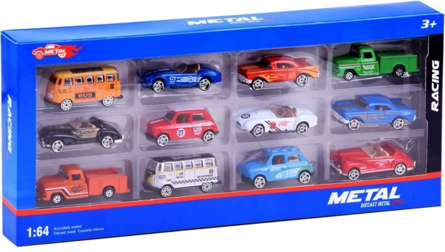 Ajándékcsomagolás tizenkét modellel egy áttekinthető vitrinben, amely örömet szerez a kis versenyzőknek és a gyűjtőknek. Változatos színek és formák a végtelen játékkombinációkhoz.
