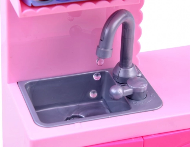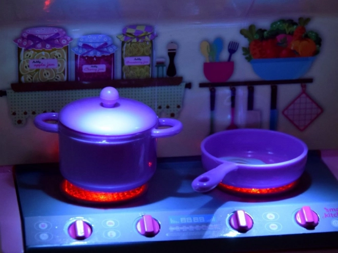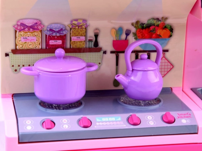 Részletgazdag tűzhely, mosogató, szekrények és sütő nyitható ajtókkal az autentikus főzősjátékért.