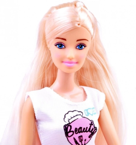 Hosszú szőke haj, divatos öltözet és kötény – ideális társ a kis szakácsnőknek és szakácsoknak.
