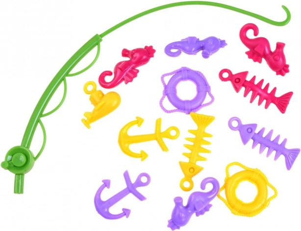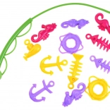A készlet tartalmaz egy horgászbotot és sok színes tengeri kincset, amelyek ösztönzik a gyerekeket az ismételt játékra és az ügyesség fejlesztésére.