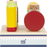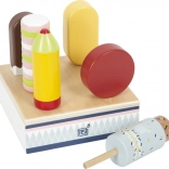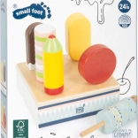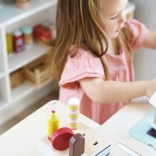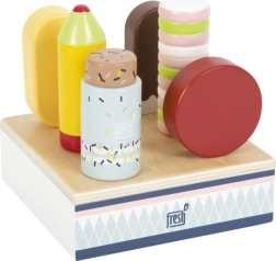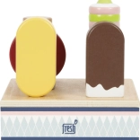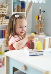 Ez a fa jégkrémszett ideális bolt vagy kávézó szerepjátékhoz. A masszív állvány mind a hat jégkrémet áttekinthetően a helyén tartja, így a kis kezek könnyen kiválaszthatják a kedvenc „ízt”, és kiszolgálhatják a vásárlókat. Az FSC tanúsítványú fa anyagnak köszönhetően a játék nemcsak szép, hanem a természetet is kíméli.