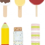 Színes, élethű formájú jégkrémek csábítanak kóstolásra, és támogatják a kreatív eladós-vásárlós szerepjátékot.