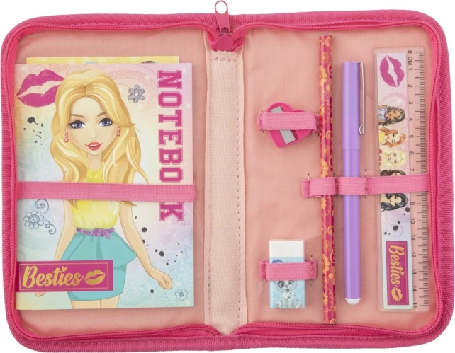 Indulj az iskolába ezzel a stílusos Besties iskolai tolltartóval, mely mindent tartalmaz, amire szükséged van: vonalzó, hegyező, toll, ceruza, radír és jegyzetfüzet.