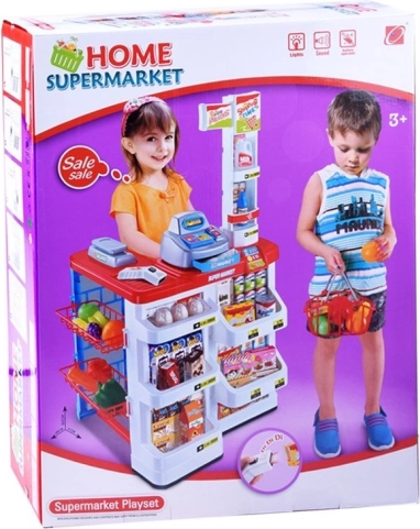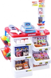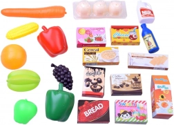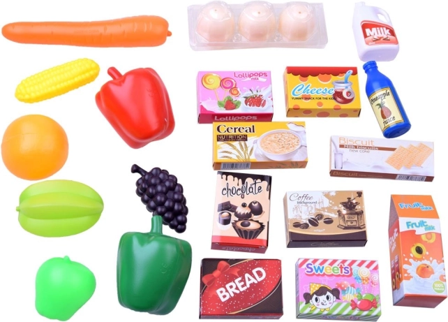 A készlet különböző realisztikus műanyag élelmiszereket tartalmaz, amelyeket a gyerekek felfedezhetnek és használhatnak az elképzelt boltjukban.