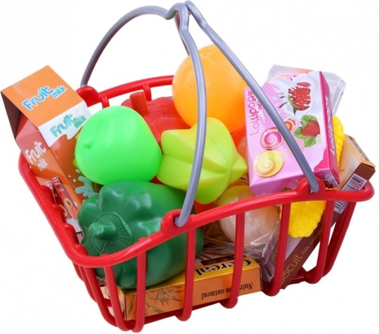Praktikus piros kosár a kisebb áruk szállítására, amely megtanítja a gyerekeket a vásárlás megszervezésére és hordozására.