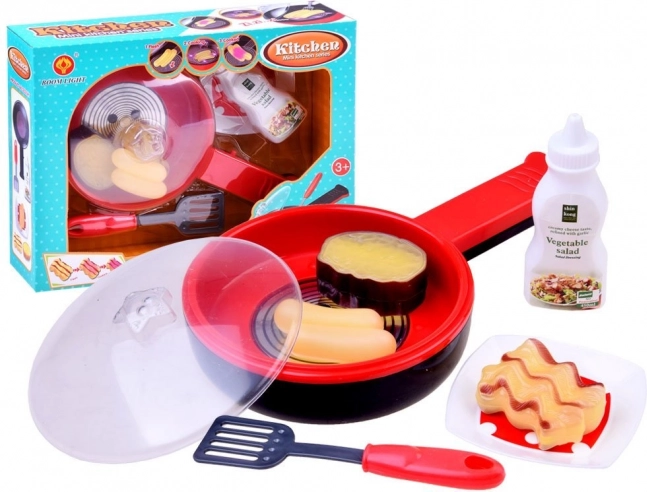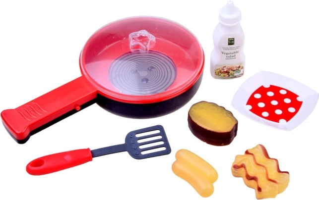 A készlet tartalmaz egy serpenyőt, fedőt, többféle élelmiszert és kiegészítőket, amelyeket a gyerekek a főzés játékához használhatnak.