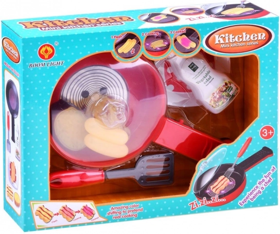 Ez a konyhai készlet nagyszerű szórakozást kínál minden gyermek számára, aki szereti a kulináris élményeket. A serpenyő a nyélén lévő gomb megnyomásakor világít és sütési hangokat ad ki, ami a játékot még valósághűbbé teszi. Emellett a sült termékek színt váltanak a serpenyőn lévő fény hatására.