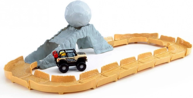A hegyi alagúttal és nagy sziklagolyóval tarkított izgalmas pálya próbára teszi a kis sofőrök ügyességét, és rengeteg akciódús szórakozást kínál.