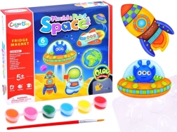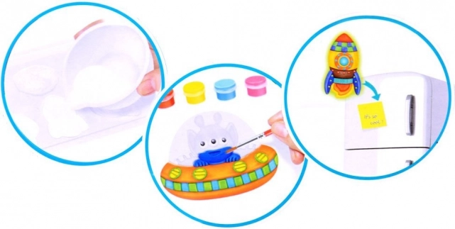 A mellékelt formáknak és festékeknek köszönhetően a gyerekek egyedi mágneseket készítenek rakétákkal, bolygókkal és űrhajósokkal. Az alkotás egyszerű és szórakoztató.