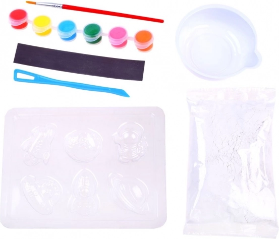 A készlet tartalmaz gipszet, tálkát, keverőpálcát, 6 festéket, ecsetet, mágnesszalagot és útmutatót – csak vizet kell hozzáadni, és kezdődhet az alkotás.