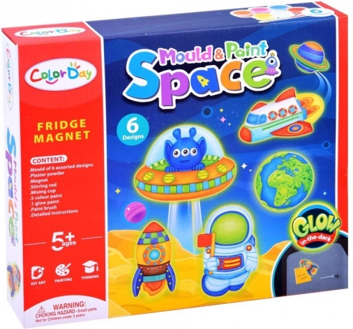 Változtassa a otthon töltött időt kreatív élménnyé. A gyerekek először gipszöntvényeket készítenek az űr témájú formákban, majd fantáziájuk szerint kifestik, végül felragasztják a mágnesszalagot – és már kész is az egyedi hűtőmágnes! Színes rakéták, bolygók és űrhajósok születnek, amelyek díszítik a hűtőt vagy a mágneses táblát.