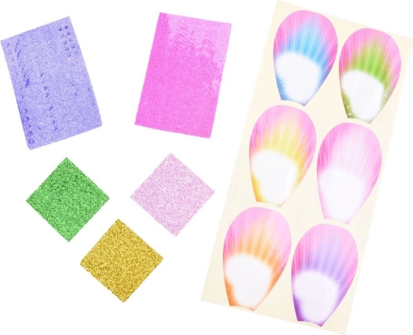 A készlet részei a matricák, csillámpor és díszítőelemek, amelyekkel a gyerekek egyedi szárnymintát és virágdekorációt készíthetnek. Az alkotás és a játék kombinációja fejleszti a finommotorikát, valamint a színek és részletek iránti érzéket – minden virág és tündér egyedi lesz.