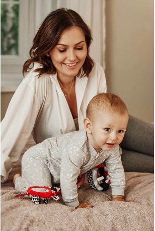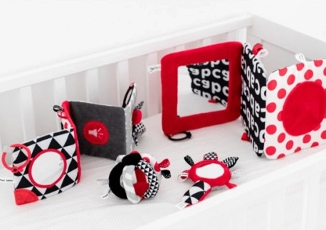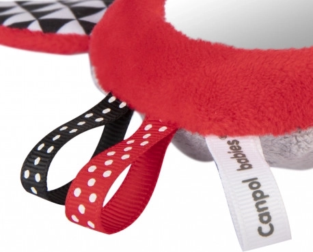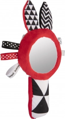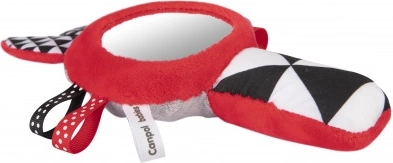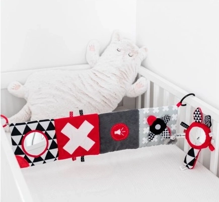A SENSORY kollekció kontrasztos sípoló csörgője tükörrel a legkisebb babák számára készült. Praktikus formájának köszönhetően a játék könnyen megfogható. A csörgő sípoló elemekkel, tükörrel és textilszalagokkal rendelkezik. A szenzoros színek stimulálják a gyermek érzékszerveinek fejlődését. További információkat a termékről ebben a videóban talál: https://www.youtube.com/watch?v=TiuOPH8SJAk&list=PLyuCTn7E_UX4T16PNxfqFjffk4yO1xNXC&index=6 Miért olyan fontosak a szenzoros játékok? A gyermek látása születéskor a legkevésbé fejlett érzék. A méhben uralkodó sötétség nem teszi lehetővé, hogy a látás a prenatális időszakban teljesen kifejlődjön. Születés után a baba látása homályos és ködös. Csak 20–30 cm-es távolságban lát körvonalakat, nagy formákat és elemeket a környezetből. Körülbelül egy hónap után kezdi érzékelni a színeket, kezdetben a pirosat és a feketét. Mintegy három hónap elteltével további élénk színekre is felfigyel. Megközelítőleg hat hónapos korban kezdi látni a részleteket a képeken, és sokkal tisztábban lát. A tizenkettedik hónapra a gyermek látása teljesen kifejlődik, mint egy felnőtté, és kiváló eszközzé válik a világ felfedezéséhez. Az új SENSORY kollekció szenzoros játékai így segítenek stimulálni a baba látását és már az élet első heteitől edzik a figyelem összpontosításának képességét. A SENSORY kollekcióról: A szenzoros játékkollekció egyéves korig készült gyermekek számára. Ebben az időszakban mennek végbe a legjelentősebb változások a gyermek pszichomotoros fejlődésében. A szenzoros játékok a piaci trendekre reagálnak, amelyek a fejlődés támogatását a játékon keresztül célozzák, amikor a szülő a gyermekkel együtt stimulálhatja a látás fejlődését, gyakorolhatja az objektumokra irányuló figyelem fenntartását, a tárgyak szemmel való fókuszálását és követését, valamint az ügyesség és a koordináció fejlesztését. Használati útmutató: Tartsa tisztán. A karbantartási útmutató a bevarrt címkén található. Figyelmeztetés! Fontos gyermeke egészsége és biztonsága szempontjából! Minden használat előtt alaposan ellenőrizze a terméket. A károsodás vagy kopás első jeleinél azonnal dobja ki, és ne használja tovább. A csomagolást a fólia határozott szétszakításával nyissa fel olló használata nélkül. Figyelmeztetés! A műanyag csomagolást tartsa gyermekektől távol, hogy megelőzze a fulladás veszélyét. A plüss csörgő megfelel az alábbi követelményeknek: Az Európai Parlament és a Tanács 2009/48/EK irányelve a játékok biztonságáról EN 71 - 1 Játékok biztonsága – 1. rész: Mechanikai és fizikai tulajdonságok EN 71 - 2 Játékok biztonsága – 2. rész: Gyúlékonyság EN 71 - 3 Játékok biztonsága – 3. rész: Egyes elemek migrációja