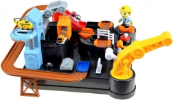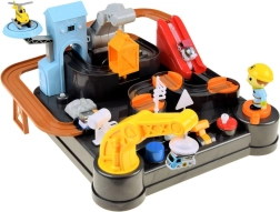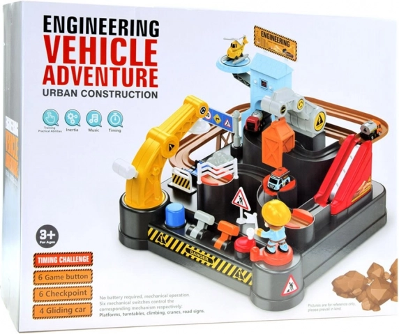 Ez a színes, építési témájú mechanikus pálya teljes építési jelenetet kínál akadályokkal, felvonóval és mágneses daruval. A gyerekek a járműveket a rakodástól a kirakodásig vezethetik, irányíthatják a forgóasztalokat és karokat, és figyelhetik, ahogy a kisautók végighaladnak az útvonalon. A toronyba épített digitális óra méri a menetidőt, és bekapcsoláskor vidám dallamot játszik le.