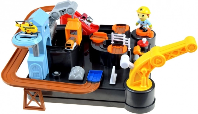 - Pálya akadályokkal, mágneses daru, felvonó, 3 építő kisautó, helikopter, építőmunkás figura, torony digitális órával
