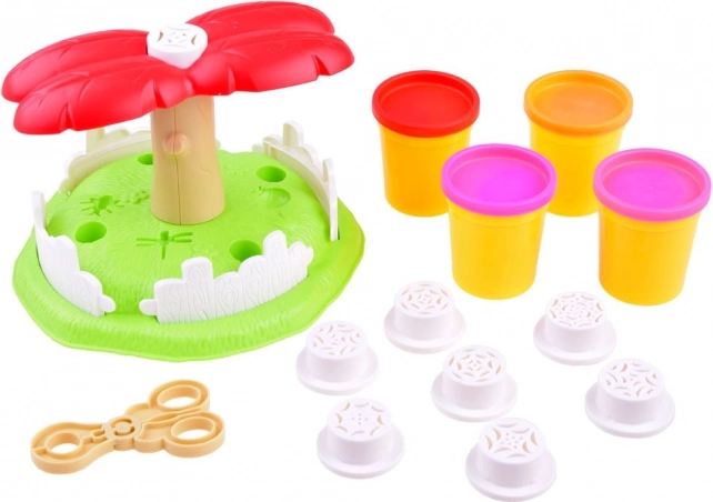 A készlet lehetővé teszi a gyerekek számára, hogy különböző tarka formákat és virágokat hozzanak létre négy színű gyurma felhasználásával.