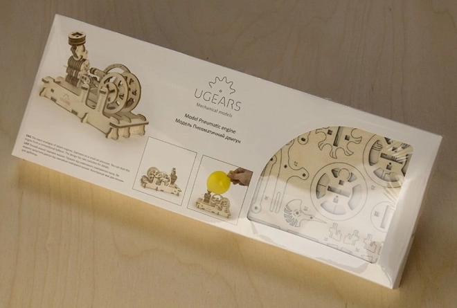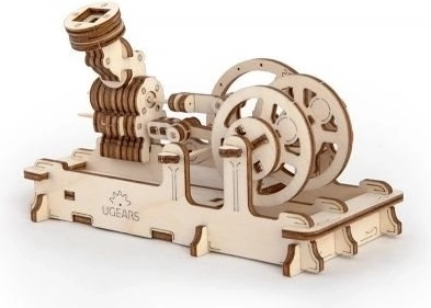 Ez az átgondolt fa modell a gőzgép kicsiny, de hű megfelelője. Minden alkatrész pontosan illeszkedik, így az építéshez nem szükséges ragasztó. Elég belefújni a speciális üregbe, és a légmotor beindul – működés közben láthatja a fogaskerekeket és a dugattyúkat.