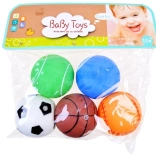 Ez a változatos készlet öt színes gumilabdát tartalmaz a kedvelt sportok inspirációjával: foci, kosárlabda, tenisz, baseball és amerikai foci. Az integrált sípoló betétnek köszönhetően megnyomáskor vidám hang hallatszik, amely felkelti a gyerekek kíváncsiságát és fejleszti a finommotorikát.
