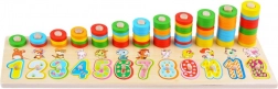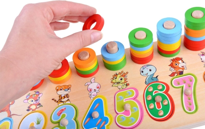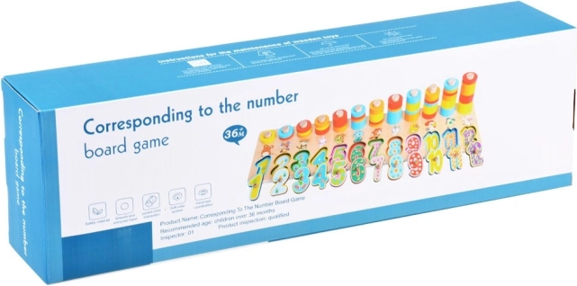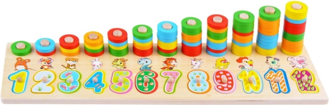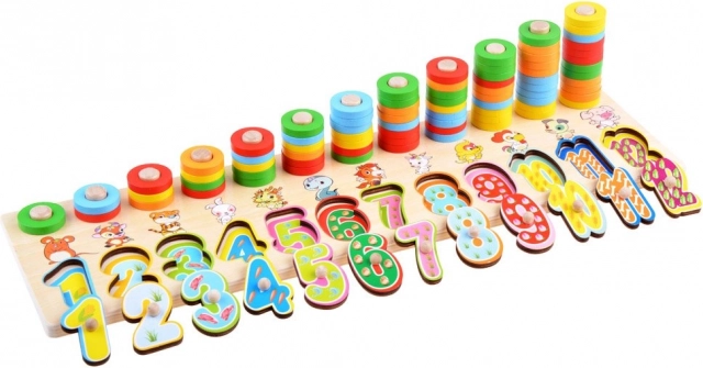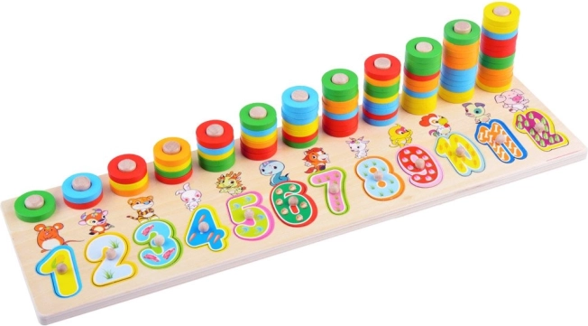 Ez az oktató fa játék ötvözi az alakok kirakását, a színek szerinti válogatást és az első matematikát. A gyerekek a nagy számjegyeket a megfelelő nyílásokba helyezik, a színes karikákat pedig a pálcikákra fűzik, így könnyen megértik a számértéket és az alapvető számolást. Az egyes számokhoz tartozó állatillusztrációk támogatják a memóriát és a szókincs fejlesztését.