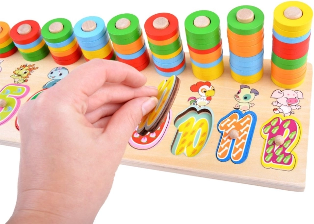 A karikák pálcikákra fűzése és a számjegyek behelyezése fejleszti a finommotorikát, a szem–kéz koordinációt és a koncentrációt.