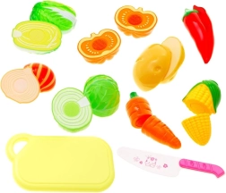 A csomagban vágódeszka, gyerekeknek készült kés és népszerű zöldségek válogatása található: paprika, répa, burgonya, káposzta, hagyma, kukorica, saláta és tök. Mindez élénk színekben, amelyek játékra csábítanak és segítik a biztonságos főzés alapjainak elsajátítását.