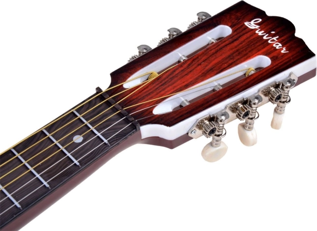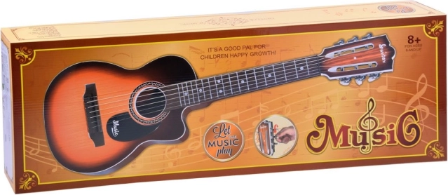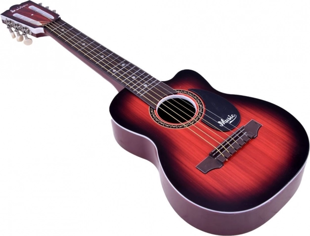 Könnyű gyermekgitár 6 fém húrral és állítható nyakkal, ideális a kis kezekhez. Valósághű famintás megjelenést kínál, és kiváló játék a zenei érzék fejlesztéséhez.