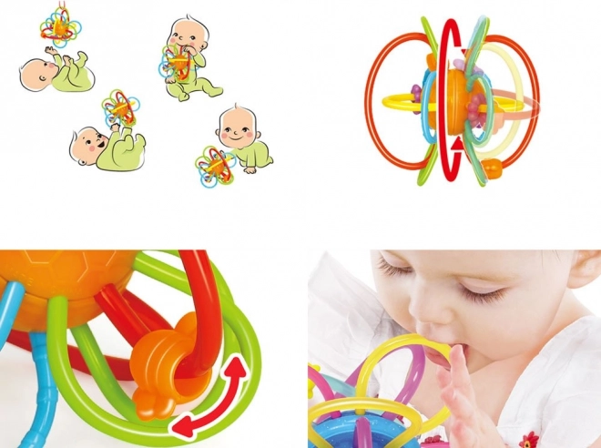 Ez a kreatív „gömb” összefonódó hurkokkal és gyöngyökkel természetes módon ébreszti fel a gyermek érzékeit. A rugalmas és hajlékony hurkok a legkisebb kezek számára is kellemes fogást biztosítanak, míg a sima, puha felület finoman masszírozza az ínyt. A csúsztatható gyöngyök és a lágy csörgés támogatják a hallási észlelést és a koncentrációt.