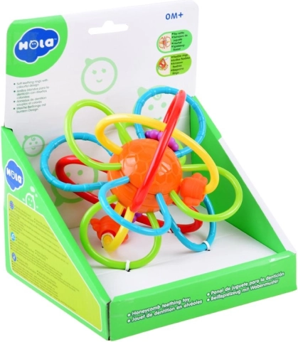 A színes HOLA érzékszervi rágóka csörgővel támogatja az érzékelés, a finommotorika és a kéz–szem koordináció fejlődését. A rugalmas hurkoknak köszönhetően könnyen megfogható, sima, puha felülete masszírozza az ínyt, és enyhülést nyújt a fogzás időszakában. Könnyű, biztonságos és fejlesztő kialakítása visszafogott színekkel gazdag tapintási és vizuális ingereket biztosít.