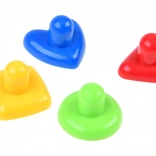 Négy színes pecsét – szív, háromszög, négyzet és kör – segíti a formák és színek felismerését, valamint a finommotorika fejlődését.