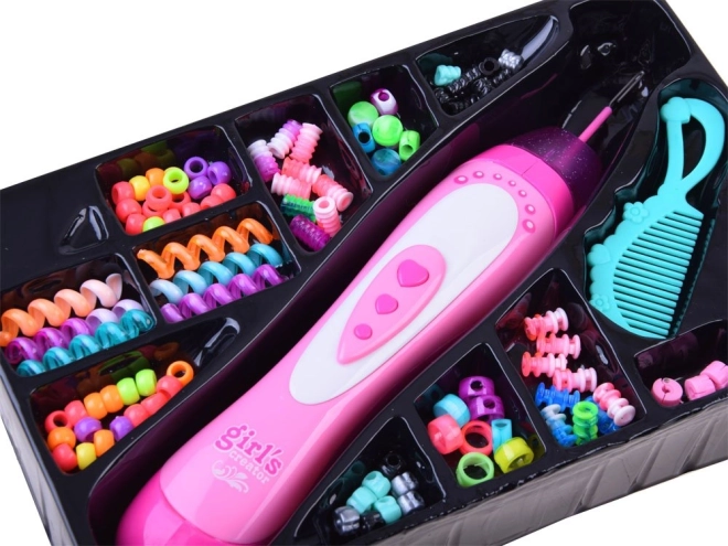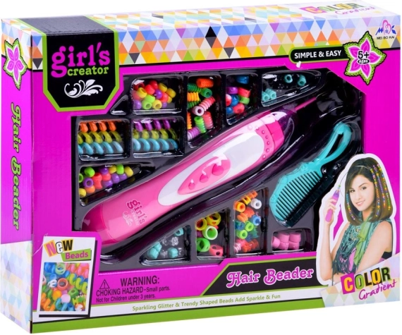 Különböző alakú és színű gyöngyök, klipszes gyöngyök, színes spirálok és fésű – végtelen sok frizurát alkothatsz.