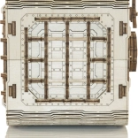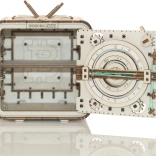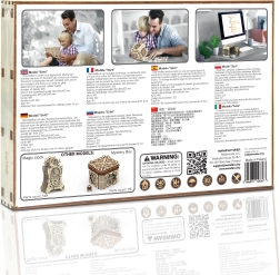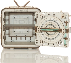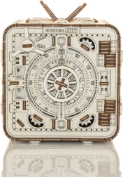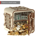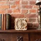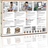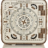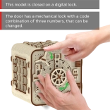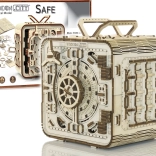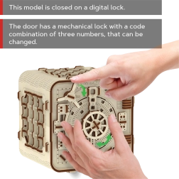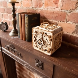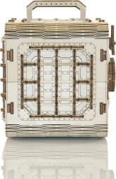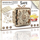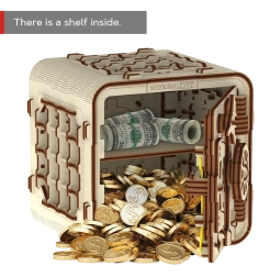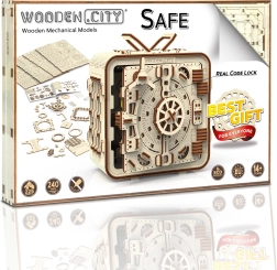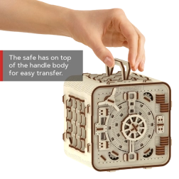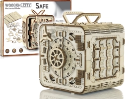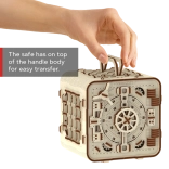 A Wooden City 3D puzzle széf ideális ajándék a rejtvények és a szép design kedvelőinek. Ez a funkcionális modell a banki trezor mechanizmusát utánozza háromjegyű kombinációval, amely bármikor megváltoztatható. A széf egy titkos funkciót is tartalmaz, amely segít, ha elfelejtené a kódot. A megjelenést a könnyű hordozást szolgáló fogantyú és a belső polcos tér teszi teljessé.